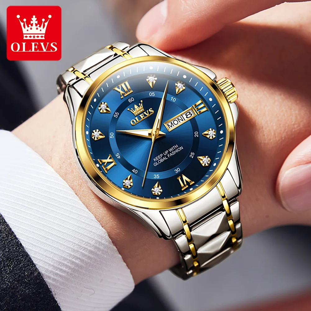 OLEVS Men’s Watch No.2906 Fashion Business Original Quartz Watches Rhombus Stainless Steel Waterproof Luminous Week Date Display