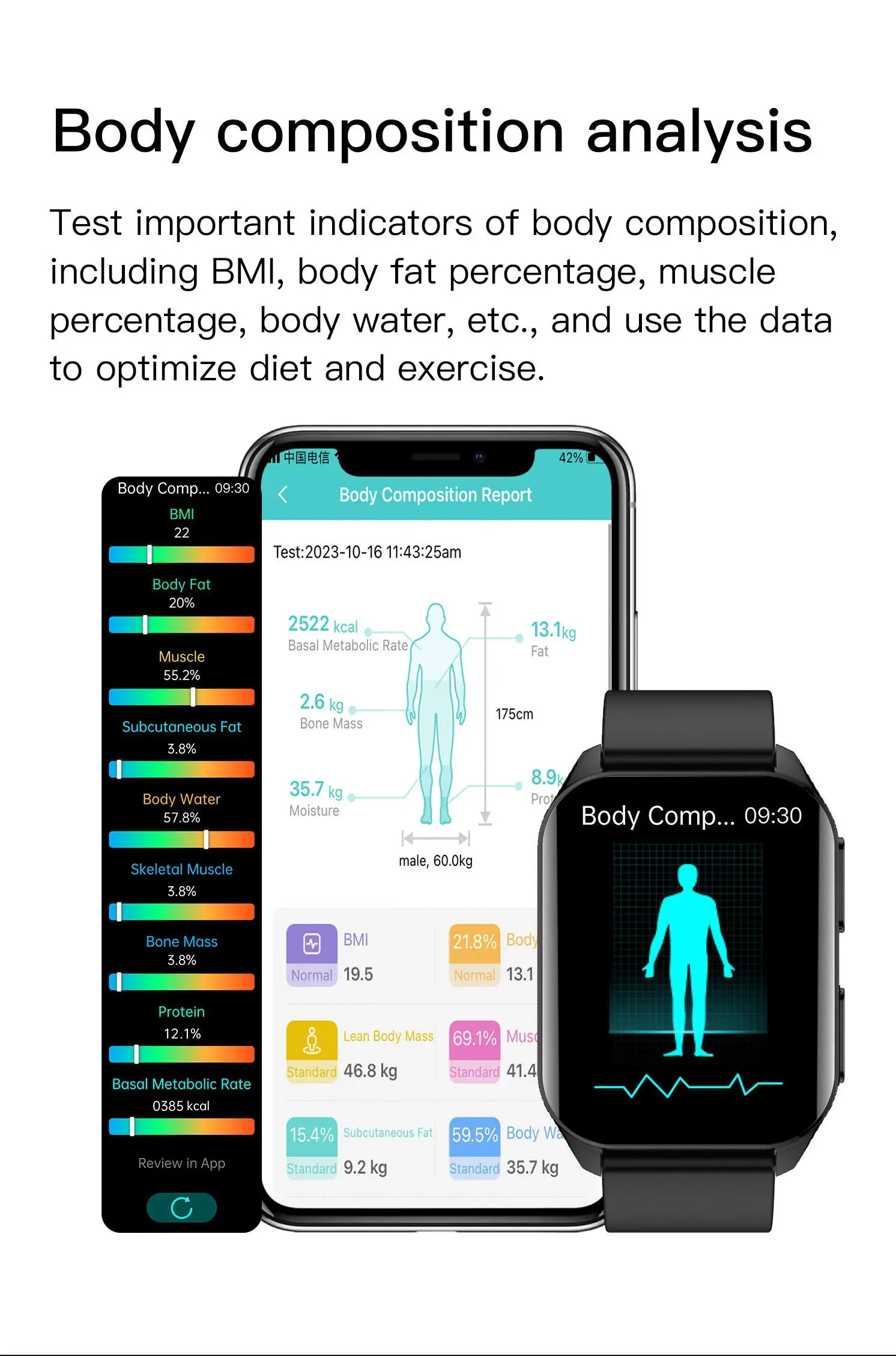 SACOSDING smart watch  is equipped with the sensor, real-time  detect your health data, such as ECG heart rate,SpO2, blood pressure, noninvasive blood glucose, met,sleep, women health and body composition. You can know your health and make a reasonable adjustment on your lifestyle, Keep an eye on your health.