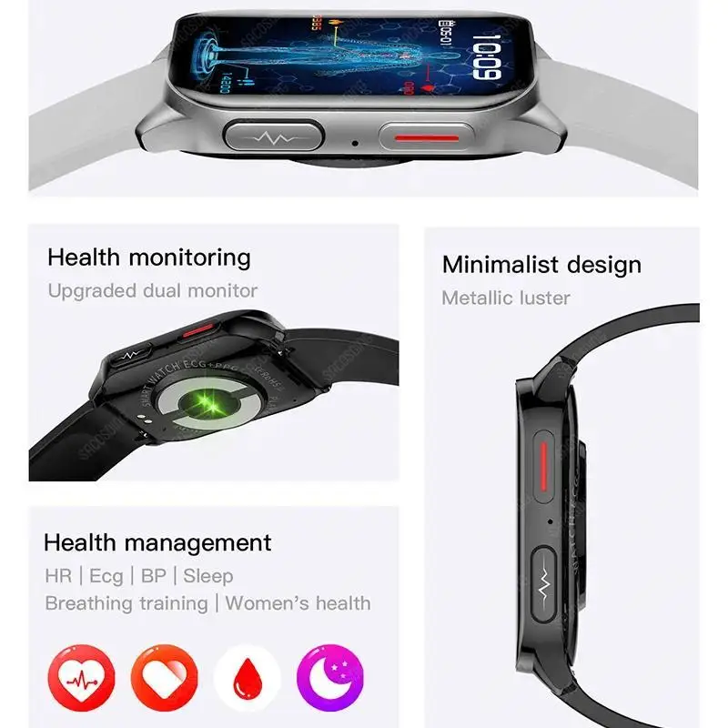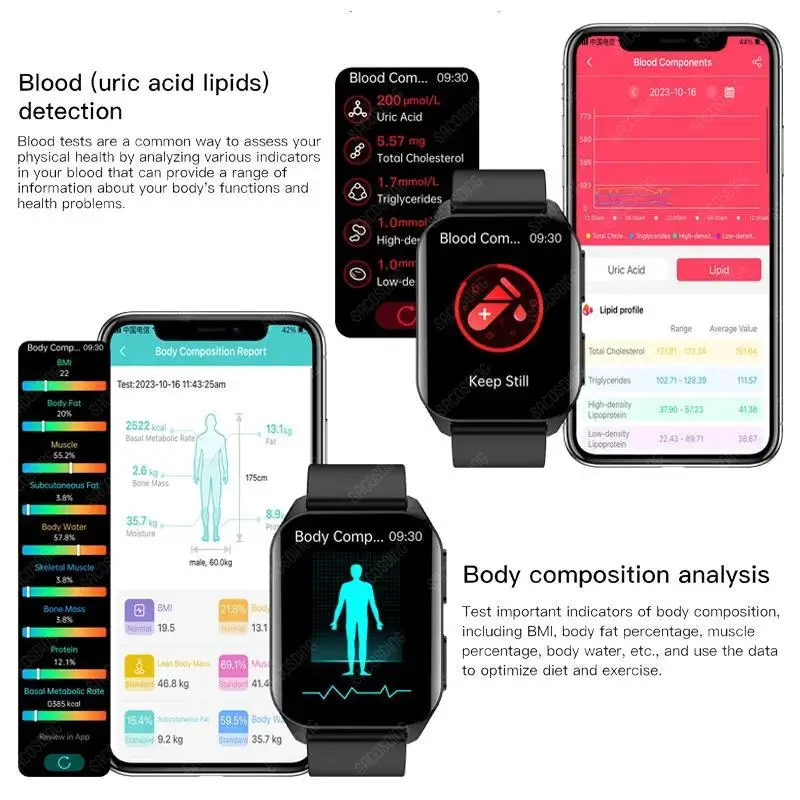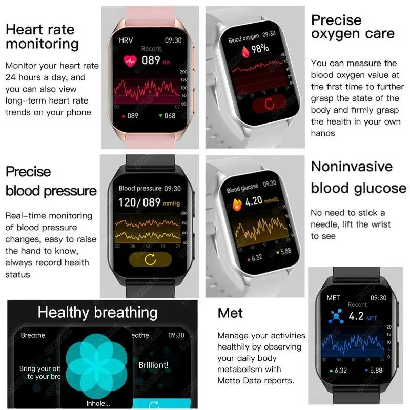 SACOSDING smart watch  is equipped with the sensor, real-time  detect your health data, such as ECG heart rate,SpO2, blood pressure, noninvasive blood glucose, met,sleep, women health and body composition. You can know your health and make a reasonable adjustment on your lifestyle, Keep an eye on your health.