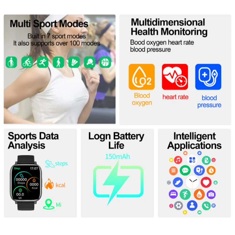 Customised alarm reminders, sedentary reminders, incoming call reminders, push messages (SMS/QQQ/WeChat, Taobao, Alipay, Facebook, Twitter, whatAPP, Instagram, LinkedIn, messenger, Skype, online, kakaotalk, Gmail, Snapchat, etc.). Push the information prompted by the mobile phoneCustom dials, ola esportemassive online dials, wrist flip, time display, remote photo, theatre/do not disturb mode setting, find Mobile phone, stopwatch, support APP over-the-air upgrade, women’s physiological period